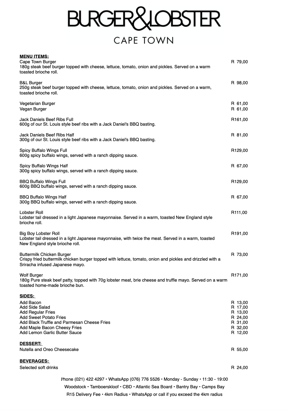 Order it on Uber Eats for R135 or Mr.D for R116. If you order it directly from Burger & Lobster it’s even cheaper. Many other options are available as you can see on the menu below from ribs, wings and even veggie burgers.