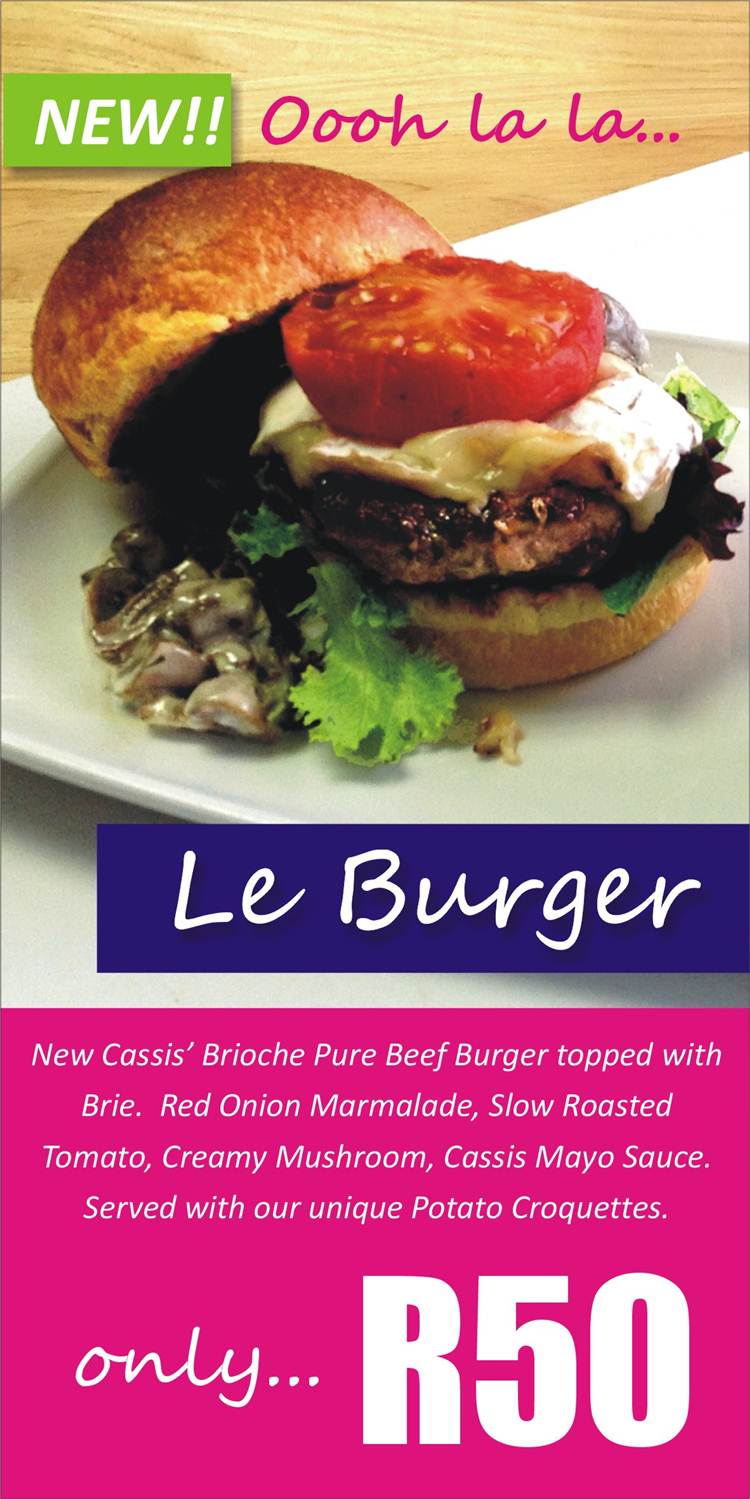 Oooh la la… Cassis Paris have just launched a new burger special: Pure beef burger topped with Brie, Red Onion Marmalade, Slow Roasted Tomato, Creamy Mushrooms, Cassis Mayo Sauce and served with their unique potato croquettes. All for only R50.