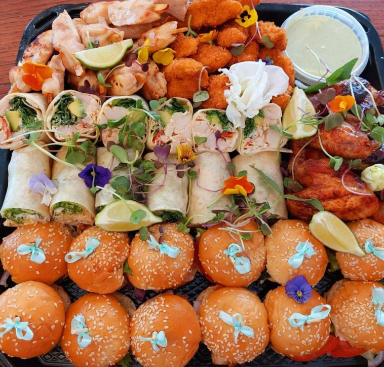 Chicken sliders offer bite-sized comfort, while wraps keep things light and easy to share. Wings bring the familiar, slightly messy appeal that no platter feels complete without, balanced by crispy Cajun chicken strips for a bit of spice and crunch. Chicken kebabs round things off with a more grilled, savoury option, all tied together with a smooth aioli dipping sauce.