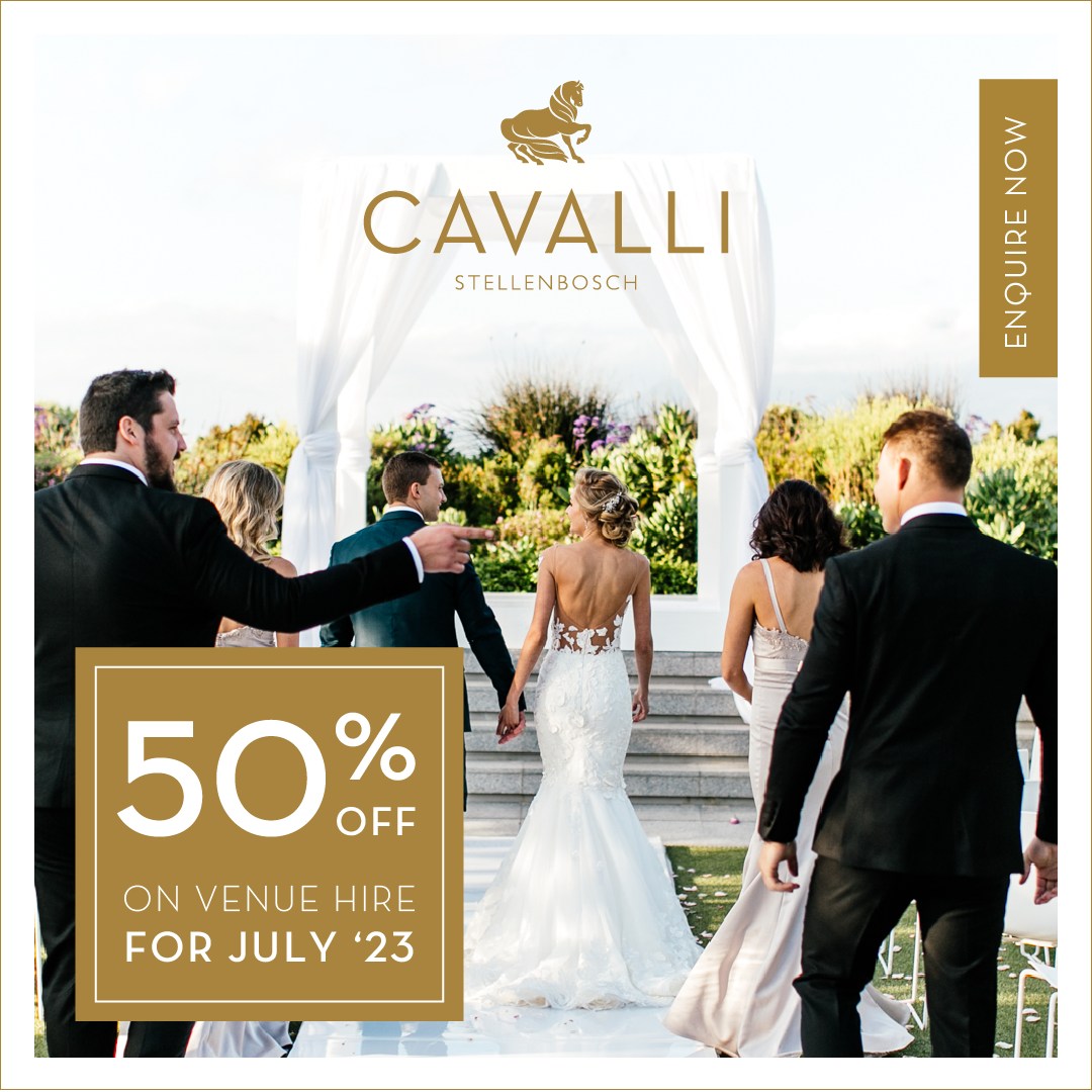 Book your wedding or corporate event with Cavalli Estate for July 2023 and receive a whopping 50% discount on the venue fee. But act fast as it’s bound to be a very popular campaign. This offer is only valid for events with a minimum of 50 guests and is subject to terms and conditions.