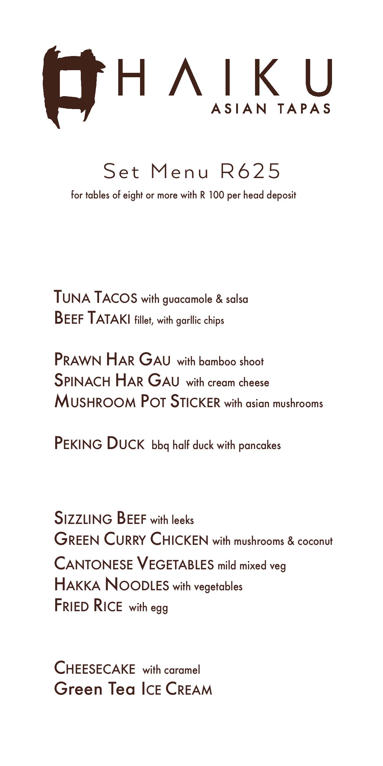 - Haiku’s renowned R625 Asian Tapas Set Menu is now going for just R495 per person – but only if you get your chopsticks in a row by 9 November. That’s the deadline to book for 8 or more guests and pay a R100 deposit per person to unlock this deal.