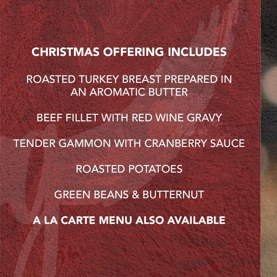 On the menu this year, you’ll find the best roasted turkey breast prepared in an aromatic butter, as well as tender beef fillet with red wine gravy and gammon with cranberry sauce. Accompanying these main dishes are classic holiday sides like green beans, butternut, and roasted potatoes. It’s the perfect combination of flavors to get you in the holiday spirit.