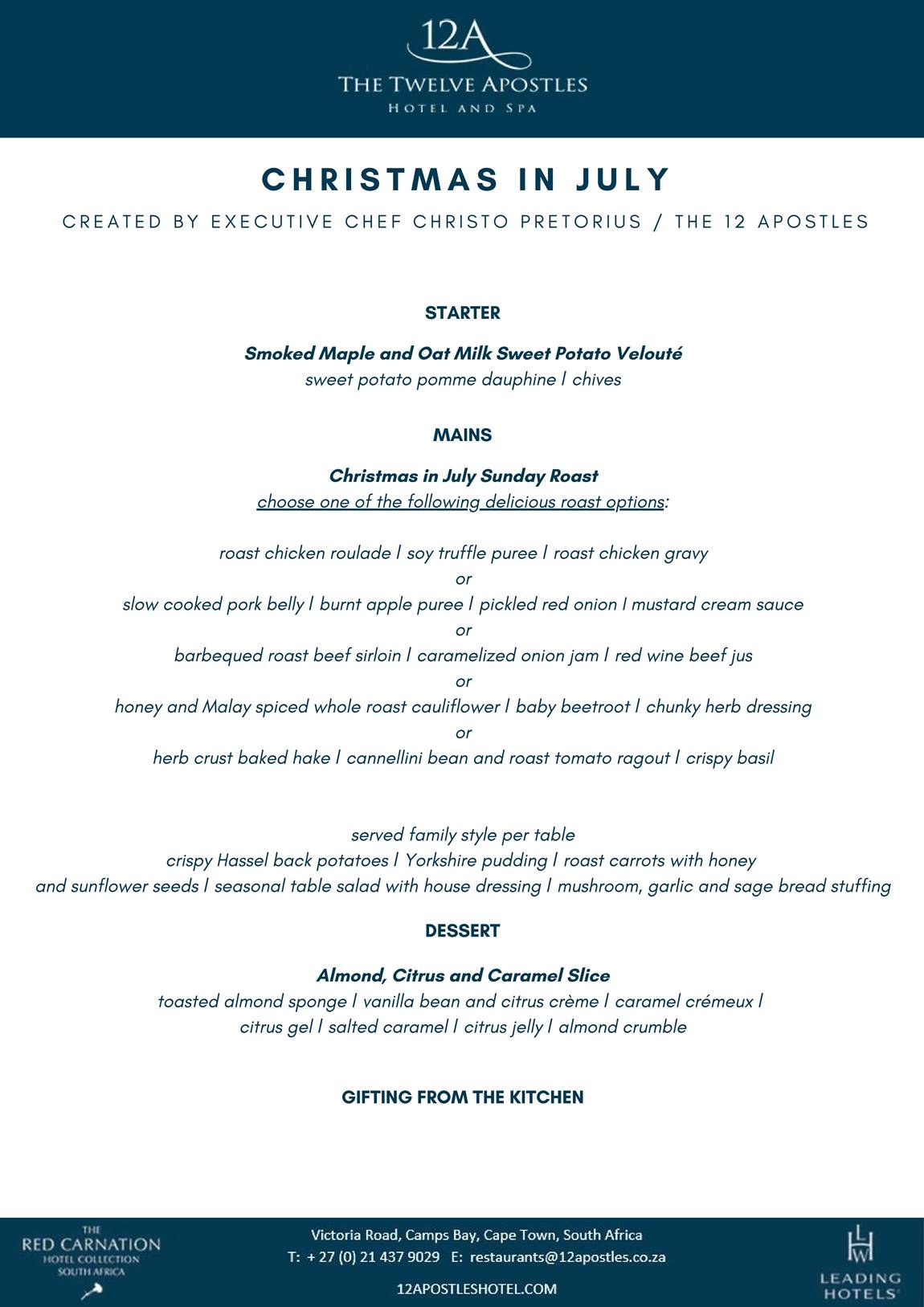 With views to die for celebrate Christmas in July on the 25th of July with a fabulous family style lunch in the Atlantic Terrace. It is the ideal place to spend the day with family and friends. Executive Chef Christo Pretorius and his kitchen brigade have put together a season spread showcasing their bountiful local ingredients.