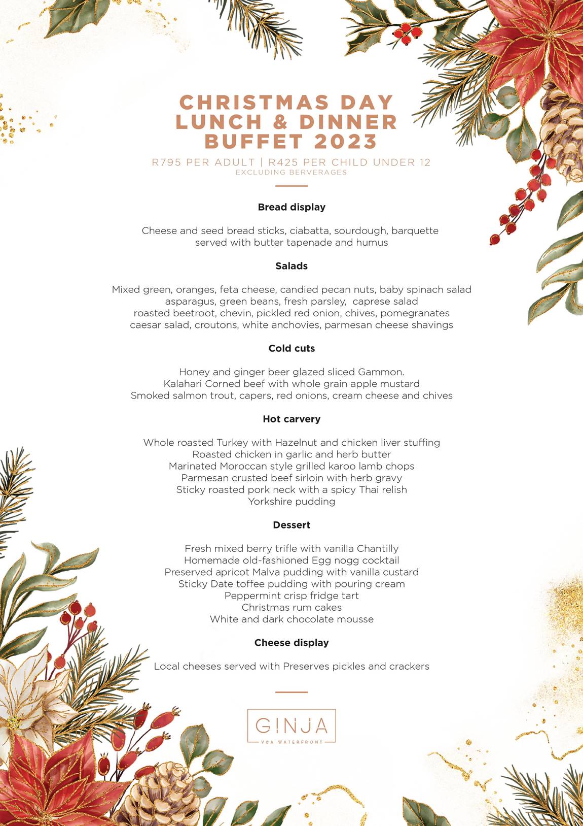 - The buffet features a diverse selection, including a tempting bread selection, vibrant fresh & crisp salads, tantalizing cold cuts, sizzling hot carvery with all your favourite Christmas cuts, delectable desserts for those with a sweet tooth, and a cheese table that adds a perfect finishing touch to the meal.