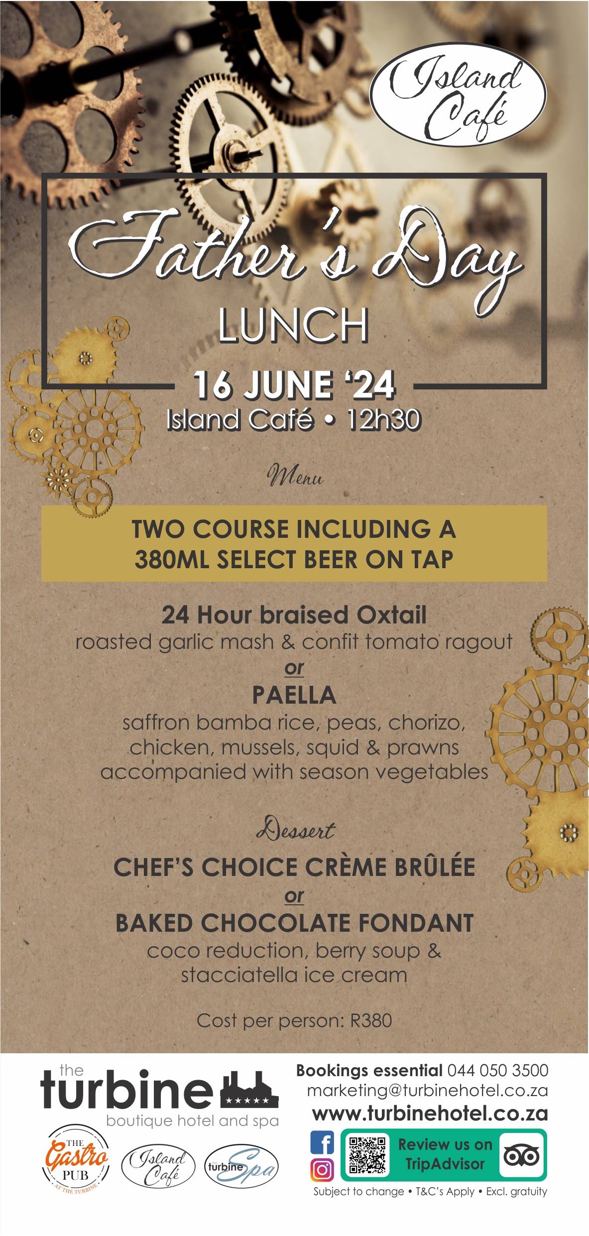Reservations are essential, so book now to ensure a special day for Dad. For bookings, contact 044 050 3500 or email marketing@turbinehotel.co.za. More information can be found at www.turbinehotel.co.za. Terms and conditions apply.