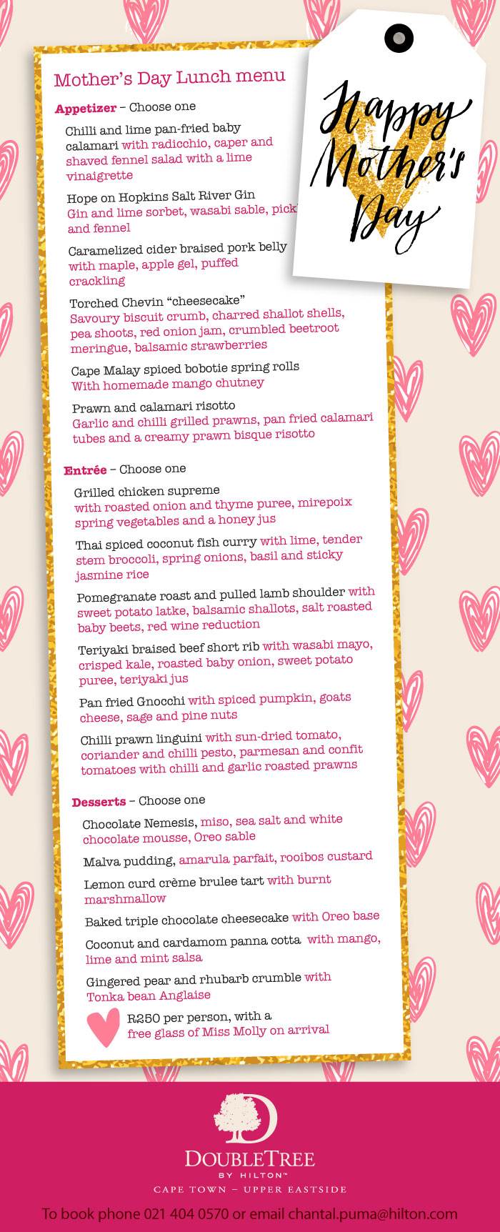An extensive Mother’s Day 3 course lunch will be on offer on Mother’s Day to celebrate the women in your life. It’s only R250 per person includes a glass of Miss Molly on arrival.