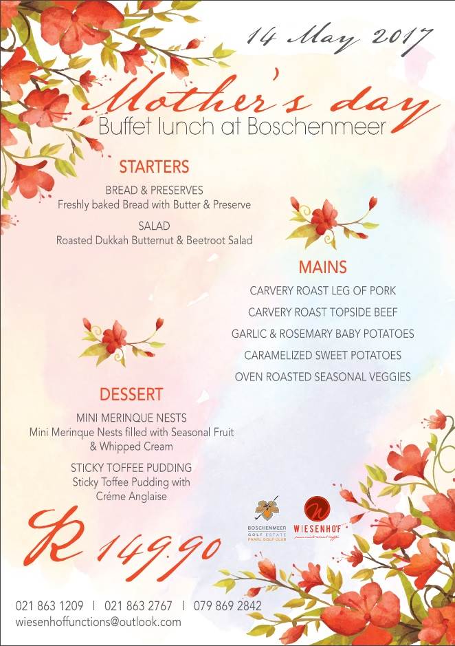 Three delicious buffet stations will be on offer during Mother’s Day on the 14th of May, which will be available for only R149.90 per person. A range of starters, mains and desserts can be chosen to make this the perfect venue to celebrate this special occasion.