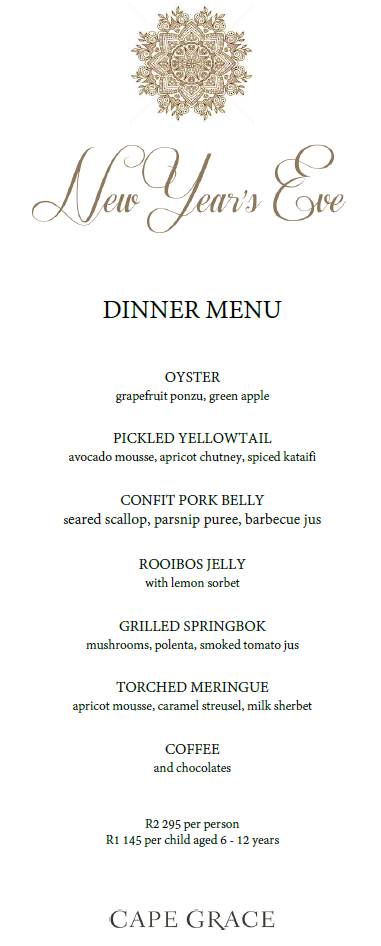 Cape Grace and Signal Restaurant are bringing out all the flair with a stunning six course dinner menu that includes oysters, yellow tail, pork belly, rooibos, springbok and a delicious dessert. The dinner menu is available for R2,295 per person and includes coffee and chocolates at the end of your dinner.