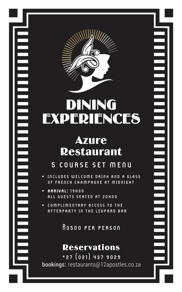 Cost: R3500 per person, which includes a glass of sparkling wine on arrival; six-course menu; a glass of champagne at midnight and gratuity.