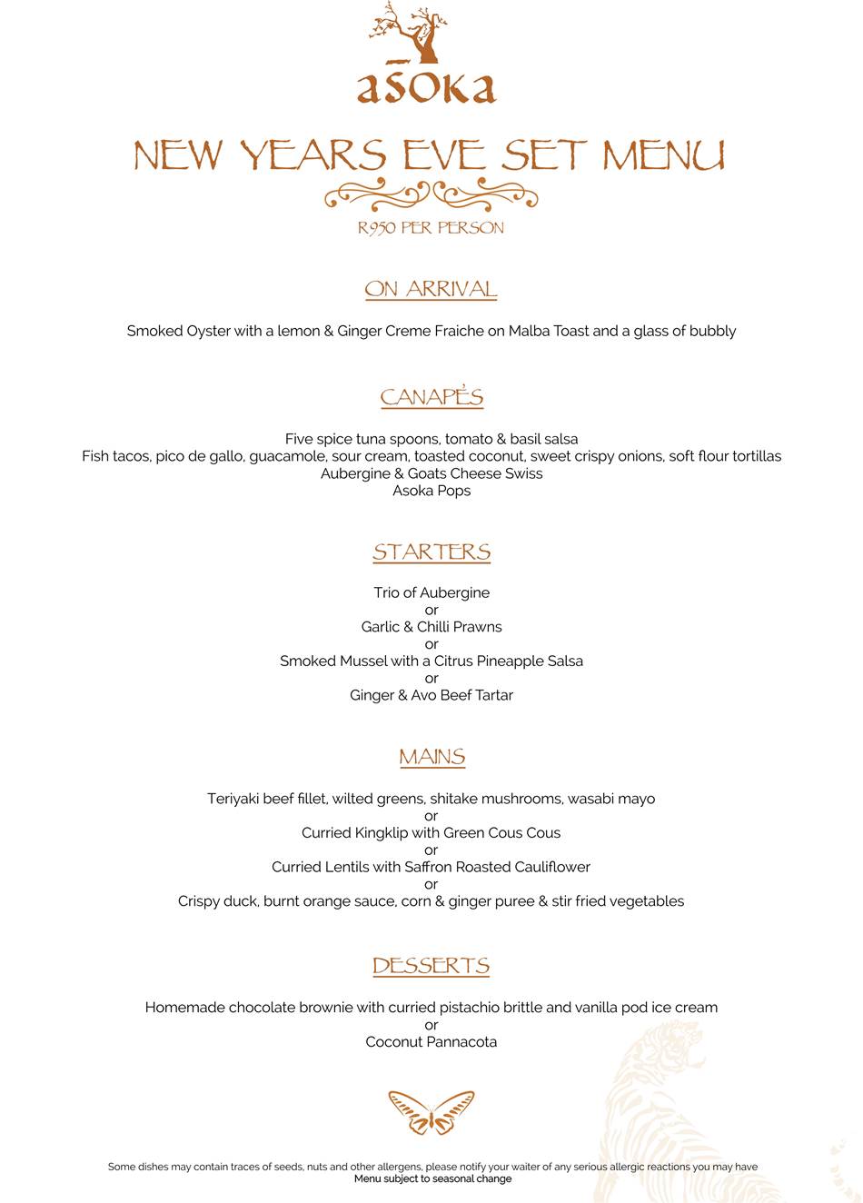 On New Year’s eve a special dinner menu has been planned to celebrate into the new year. On arrival, you will receive a smoked oyster with lemon & ginger creme fraiche on a malba toast as well as a glass of bubbly. This will be followed by a whole bunch of canapes that will get you excited about the main dinner serving. A three course menu will follow, where you have a choice of different starters, mains and desserts. This grand celebration for NYE is available for R950 per person. Booking is essential as seats are limited.