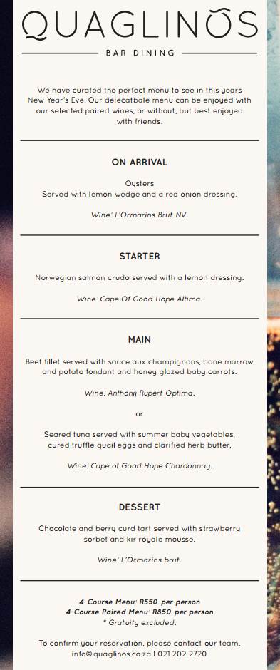 They will be celebrating their first NYE in style offering 4 course menu that includes oysters, salmon, beef fillet or tuna and a chocolate tart. All of these courses can also be paired with wine or bubbly to make the dining experience even more memorable. The menu will be available for R550 or R850 with wines.