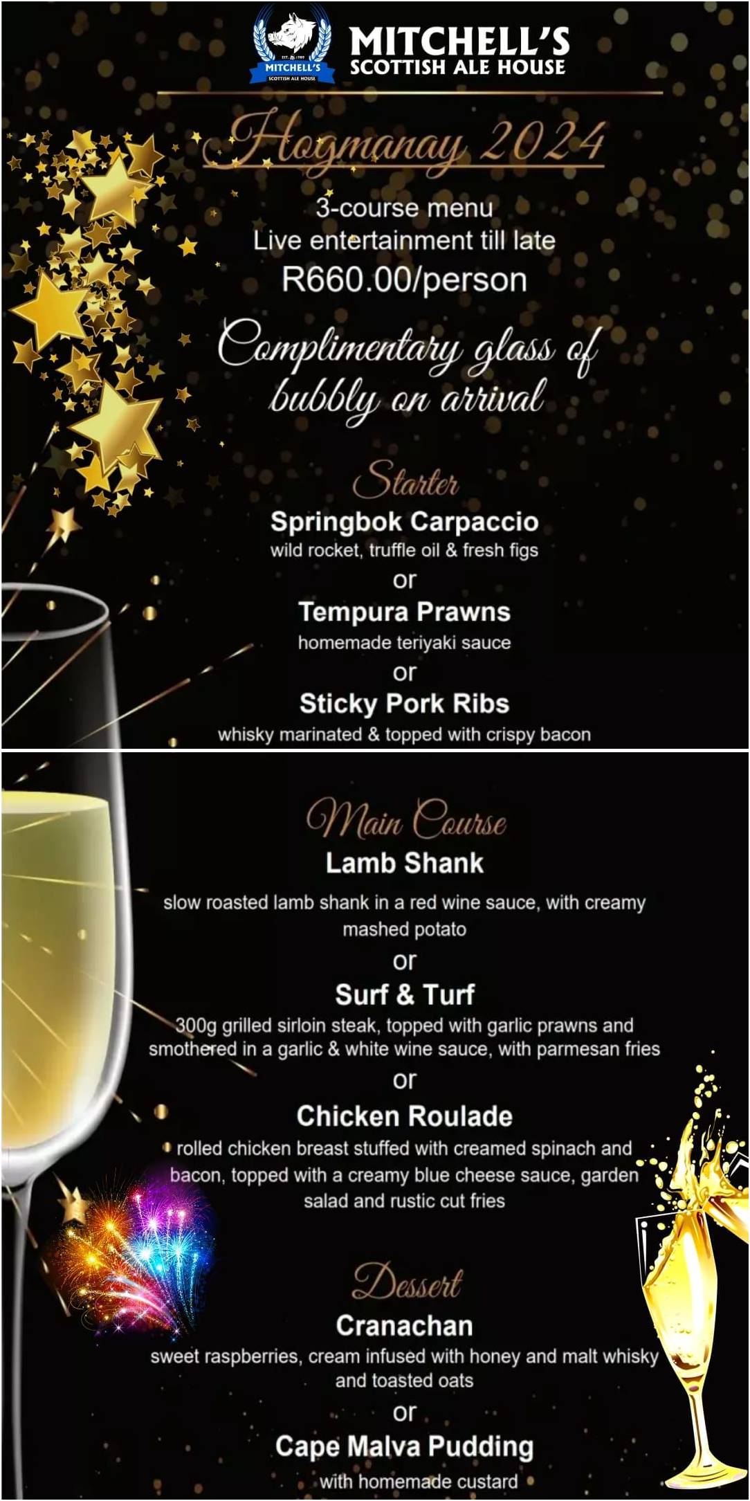 - Save room for a sweet conclusion with dessert options like the indulgent Cranachan and the timeless Malva Pudding. Priced at an attractive R660 per person, this exclusive New Year’s menu promises not only a feast for the senses but also an unforgettable night filled with live entertainment that will keep the festivities alive until the late hours.