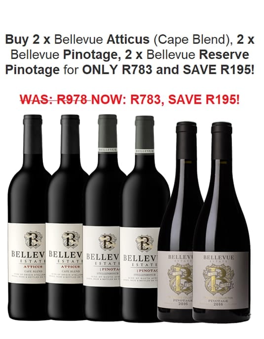 - Toast to International Pinotage Day with a mixed case of Bellevue pinotage – get 2 bottles of Bellevue Pinotage, 2 Pinotage Reserve and 2 Atticus for only R783.