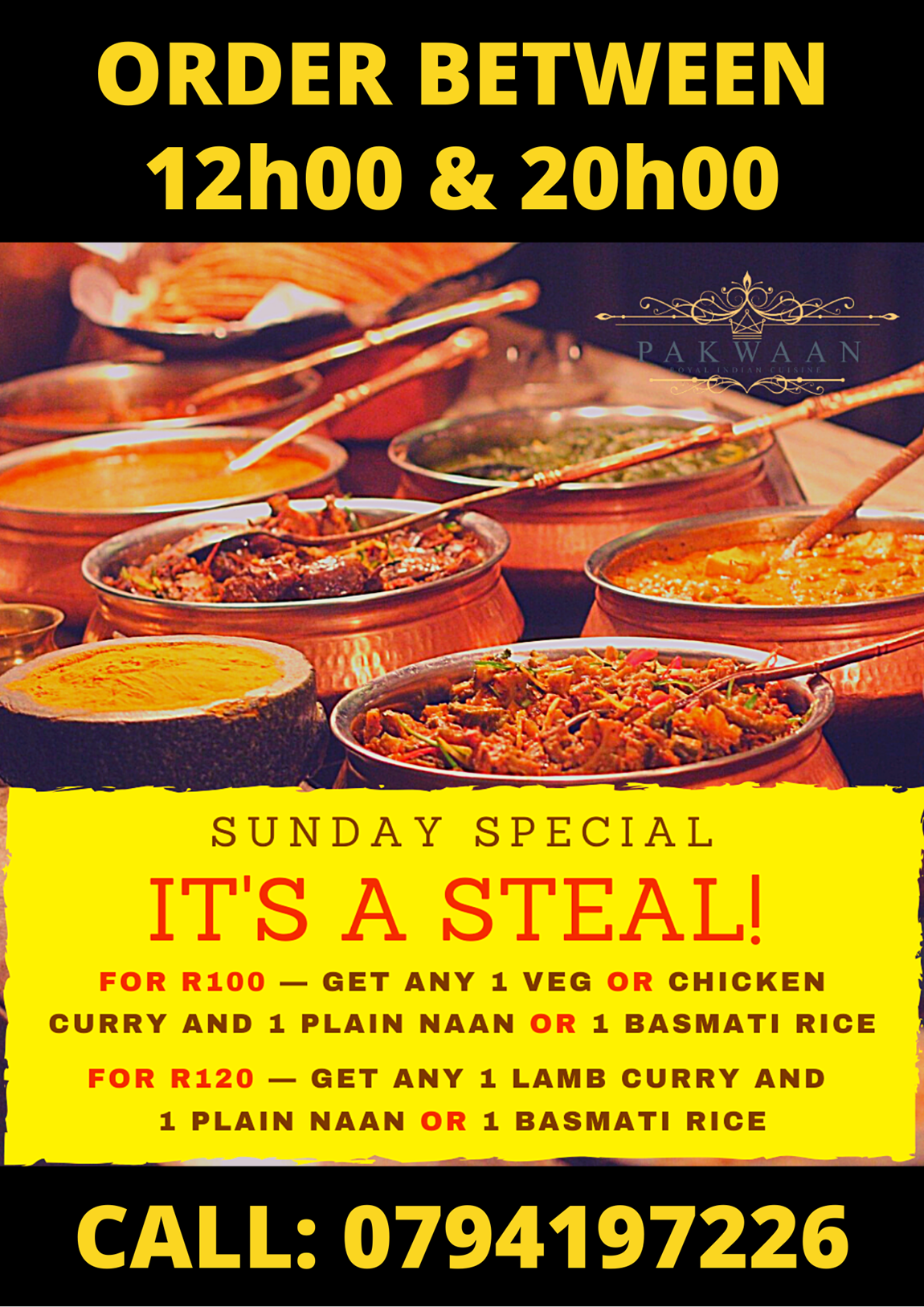 ** This Special is valid only on takeaway orders between 12h00 & 20h00 on Sunday, June 7, 2020.