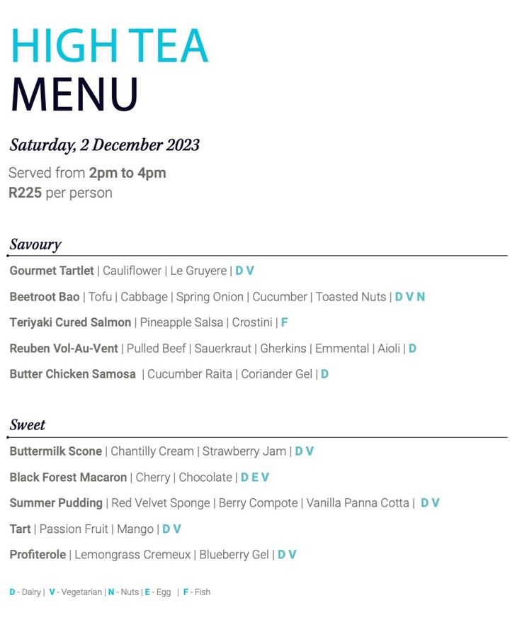 - Hosted on Saturday, 2 December 2023, from 2 pm to 4 pm, the high tea promises a delightful escape from the busy life. Priced at R225 per person, all guests can relish an array of sweet and savory treats carefully curated to satisfy discerning palates.