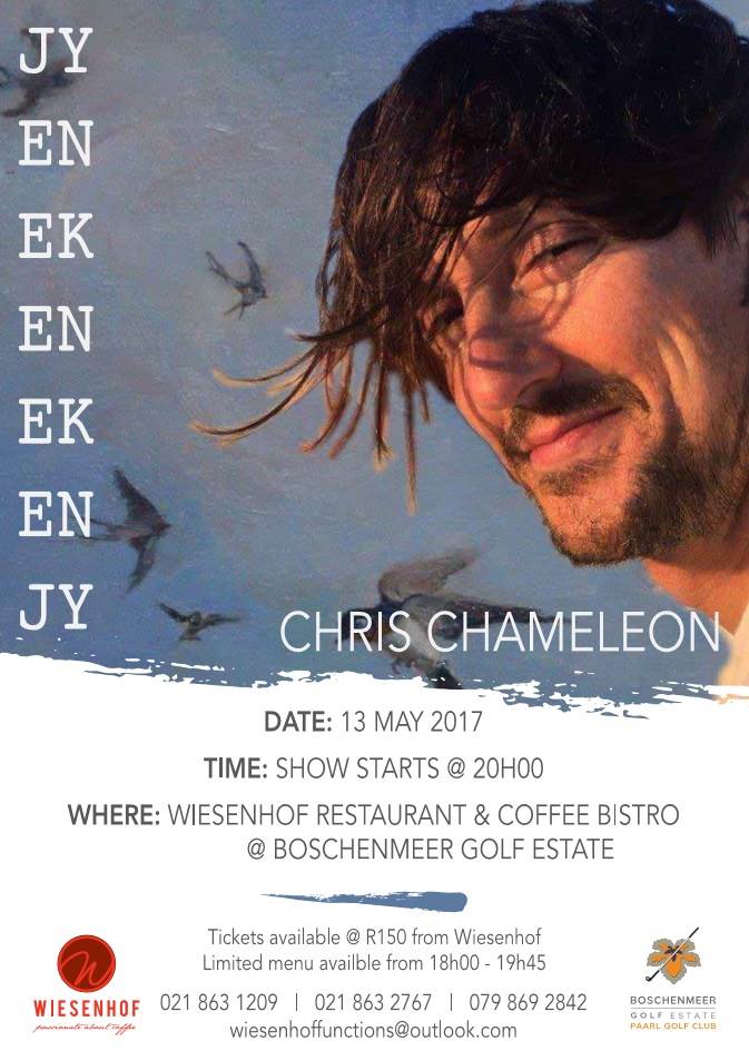 Join Wiesenhof@ Boschenmeer Golf Estate for Chris Chameleon live on the 13th of May 2017. Tickets are R150 per person. Please book in advance to avoid disappointment, tickets are limited. For bookings please contact wiesenhoffunctions@outlook.com / 021 863 1209