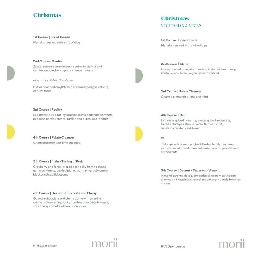 - Priced at R1750 per person, Morii’s Christmas menu showcases the restaurant’s commitment to serving the best