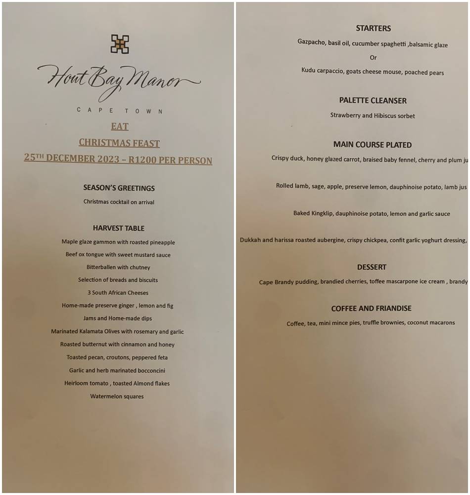 Mark your calendars for the 25th of December, 2023, as Hout Bay Manor transforms into a festive wonderland just for you.
