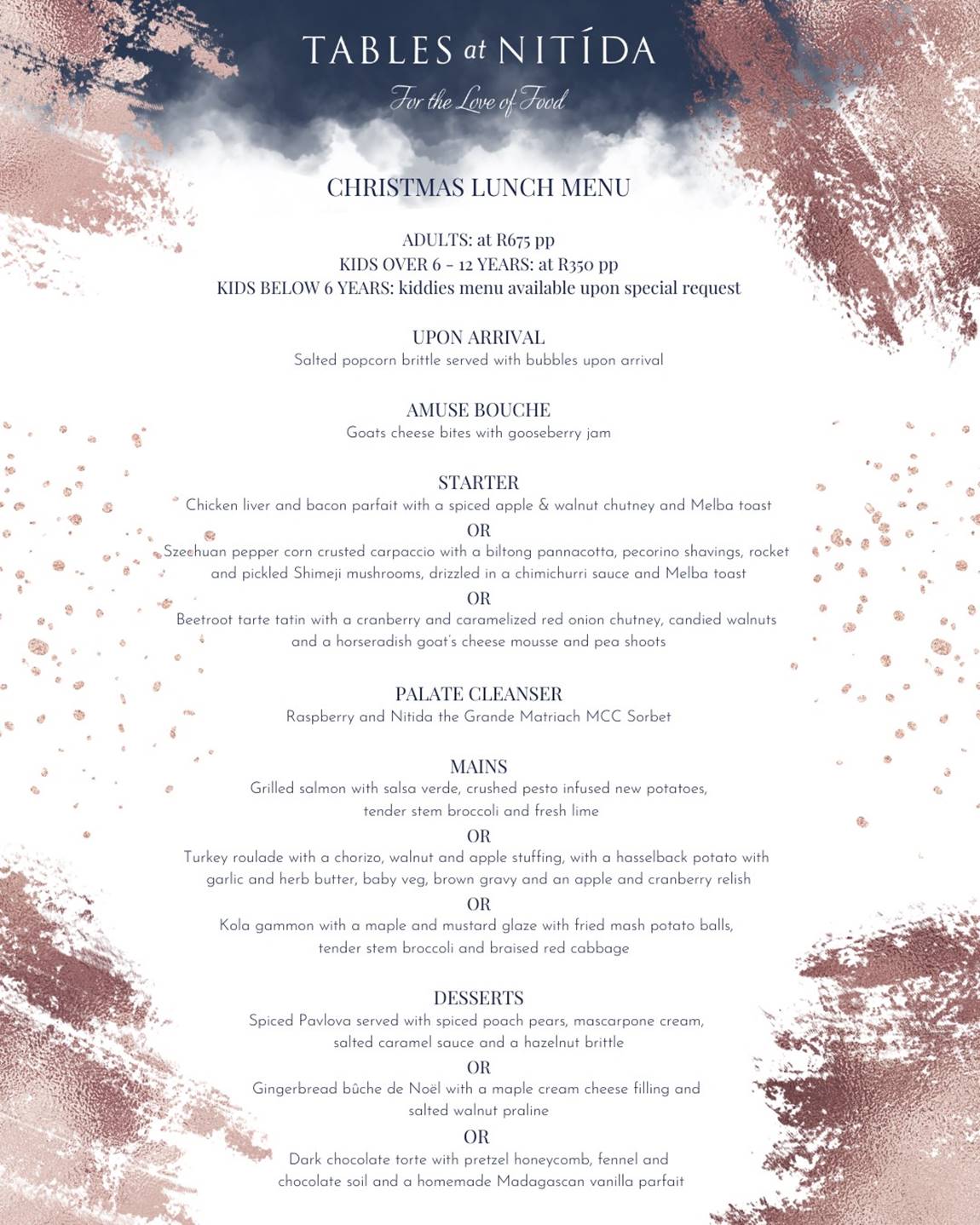 Expect world-class wine paired with incredible food at Tables at Nitida. The team have put together an incredible Christmas lunch menu that includes all the classics as well as unique Nitida creations by their culinary team. You don’t want to miss out on that one.
