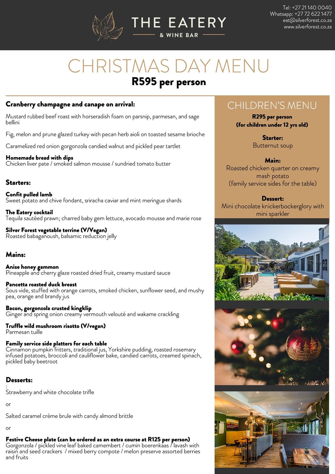 Think champagne and canapes on arrival, confit pulled lamb, roasted duck breast and chocolate trifle just as a few of the options on offer. A kids menu is also available for only R295.