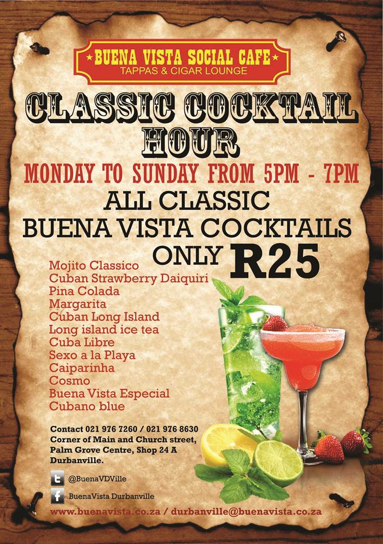 Buena Vista Social Cafe in Durbanville & Green Point are offering great cocktail specials during happy hour every day. From 5pm – 7pm, all classic Buena Vista cocktails are available for only R25.