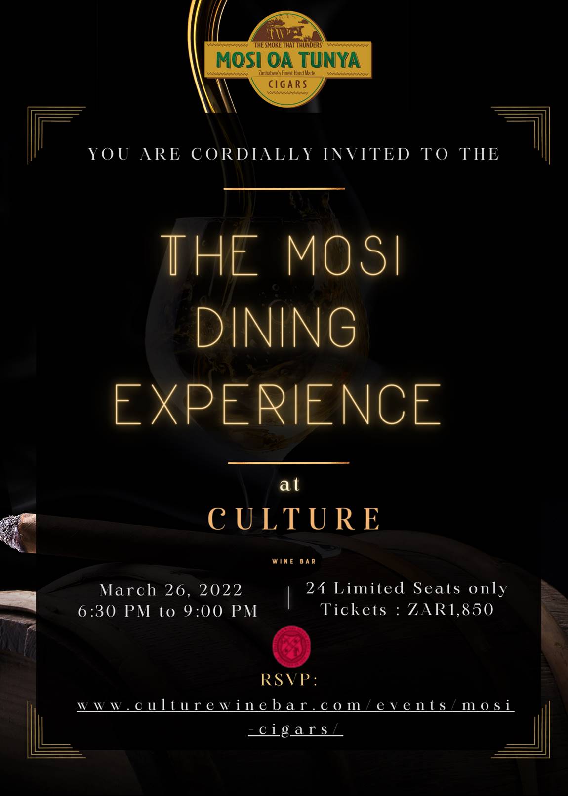 Join Mosi Oa Tunya Cigars on 26 March for an exclusive evening of ultimate pairing…cigars, fine wines, whiskey cocktails and a 3 course menu crafted by Chef Matt Manning.