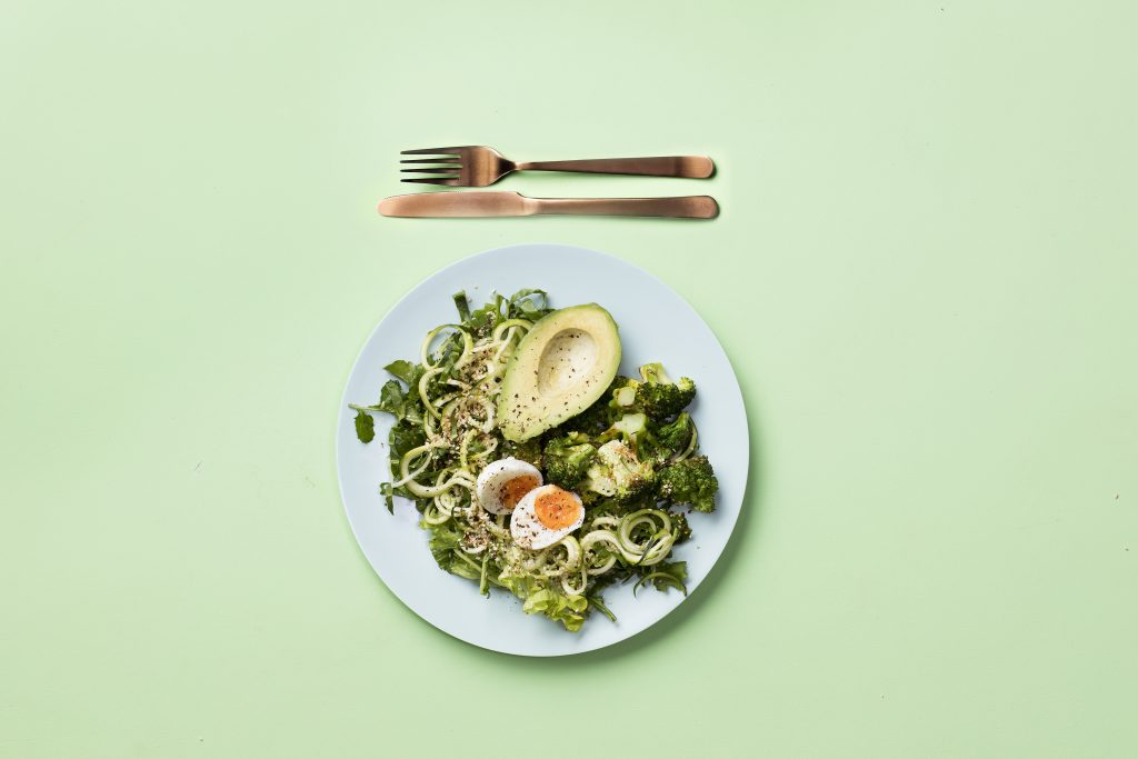A spinach, rocket and lettuce base, with zucchetti, broccoli, avocado, egg, sesame seeds and truffle yuzu dressing.
