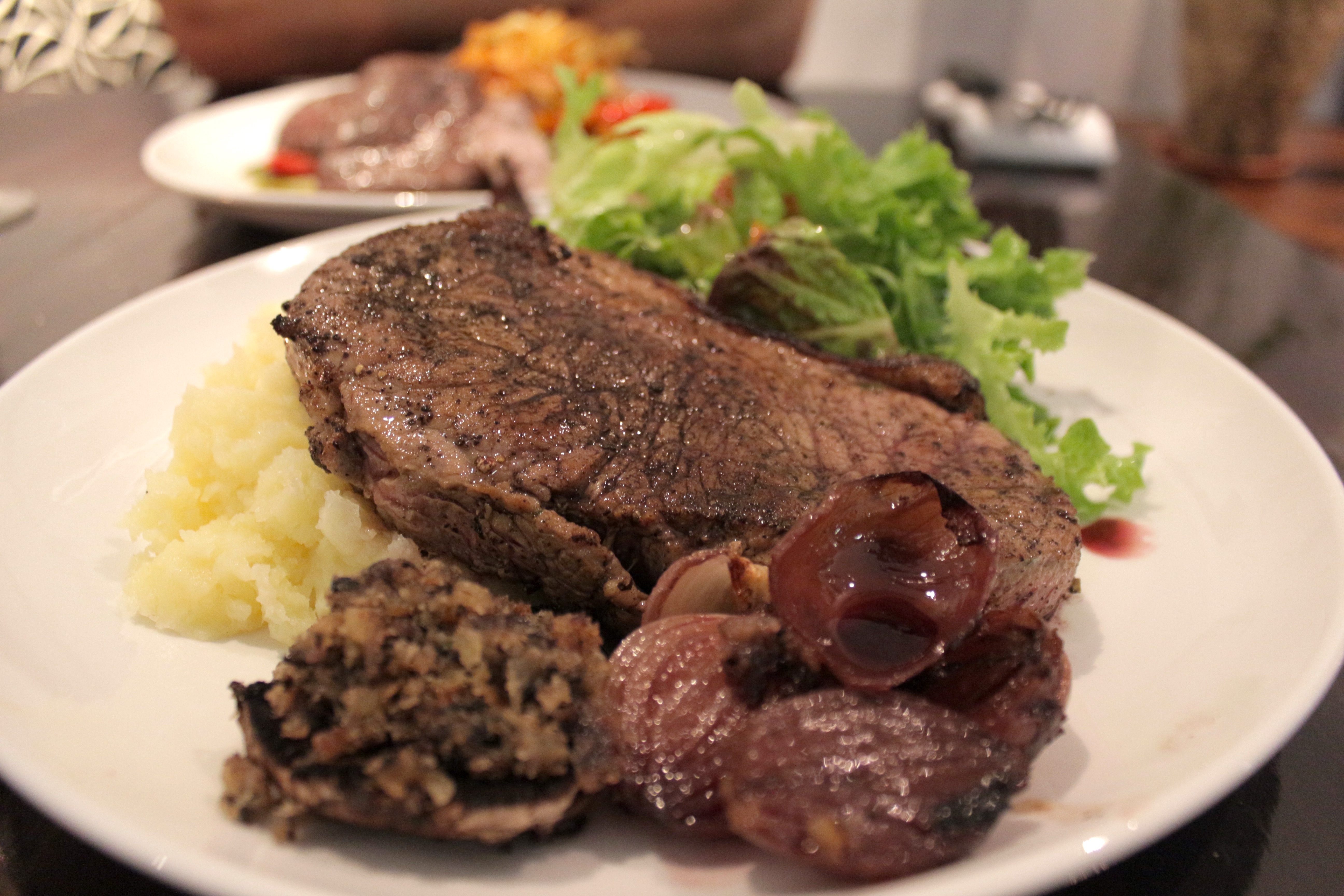 When I order steak, I say (vegetarians, look away, you shouldn’t be reading this anyway) “I want it so rare it is practically mooing”. This often makes restaurants panic, and they serve it normal rare. The sirloin was a bit overdone for me – but Marvin was the most pleased with it. Served with salad, baby red wine onions, a stuffed shroom, and either hand cut fries, mash or veg, it’s a nice big portion for the hungry.