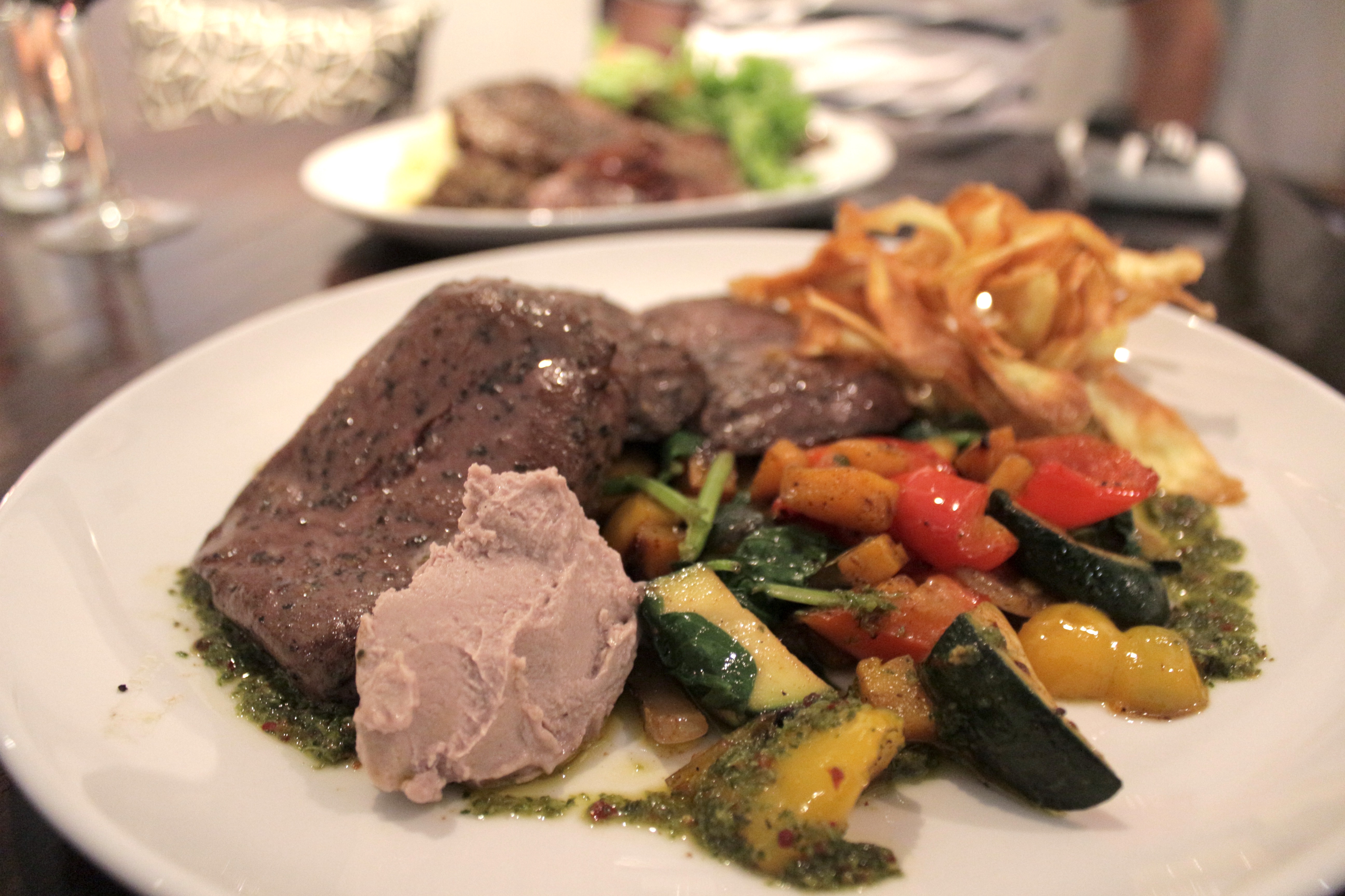 It was delicious! Tender ostrich steak in Chimichurri (a fresh Argentinian sauce, thats packed with herbs and lemon) and served with sautéed spinach and mushrooms, delicate sweet potato crisps and a red wine and thyme cream.