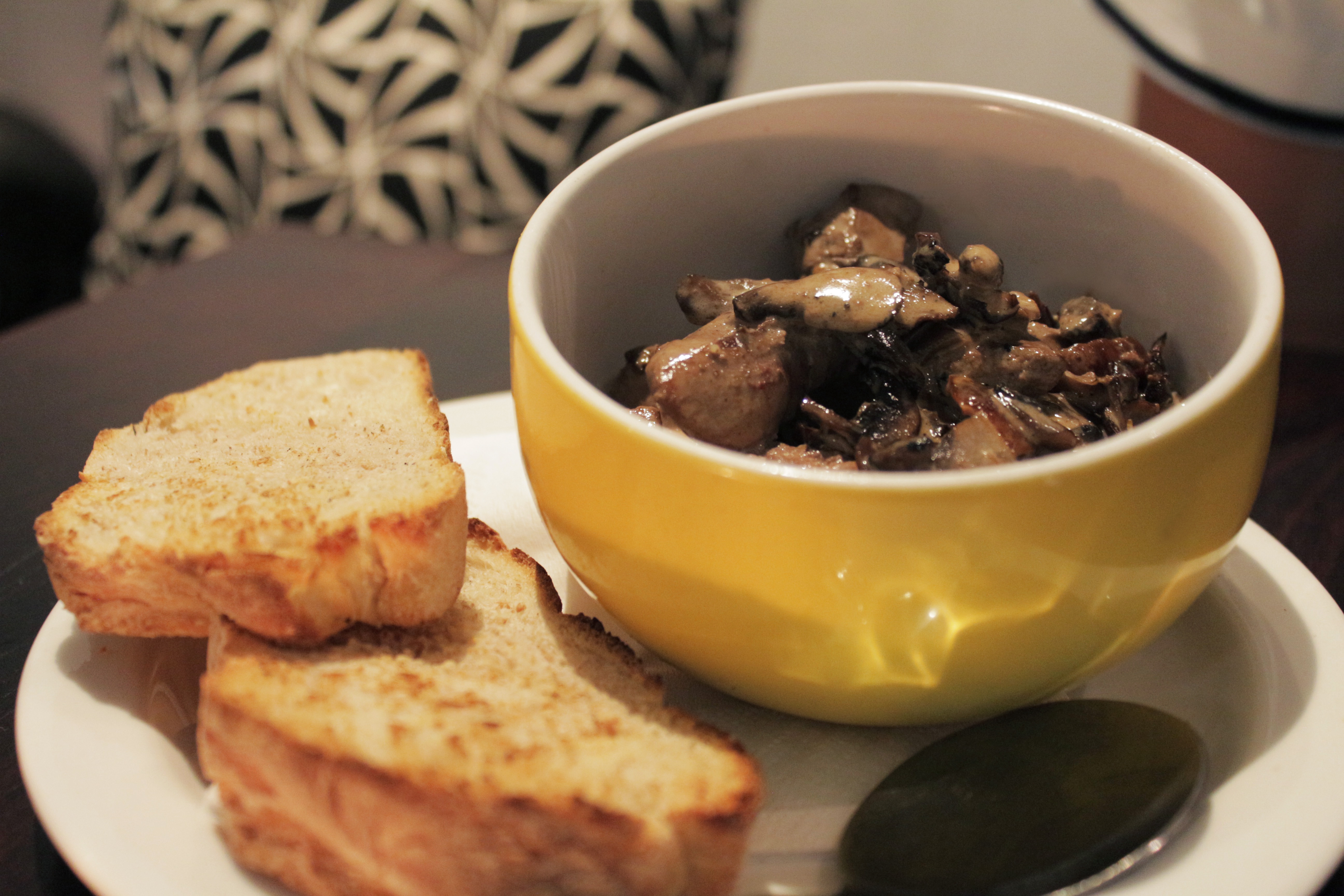 Chicken livers pan-fried with mushrooms, caramelised onions, chilli, brandy and then finished off with cream, then served with toasted ciabatta. The livers were cooked very well – slightly pink in the centre – but lacked oomph for me. An extra whack of chilli, more brandy and some salt would go a long way.