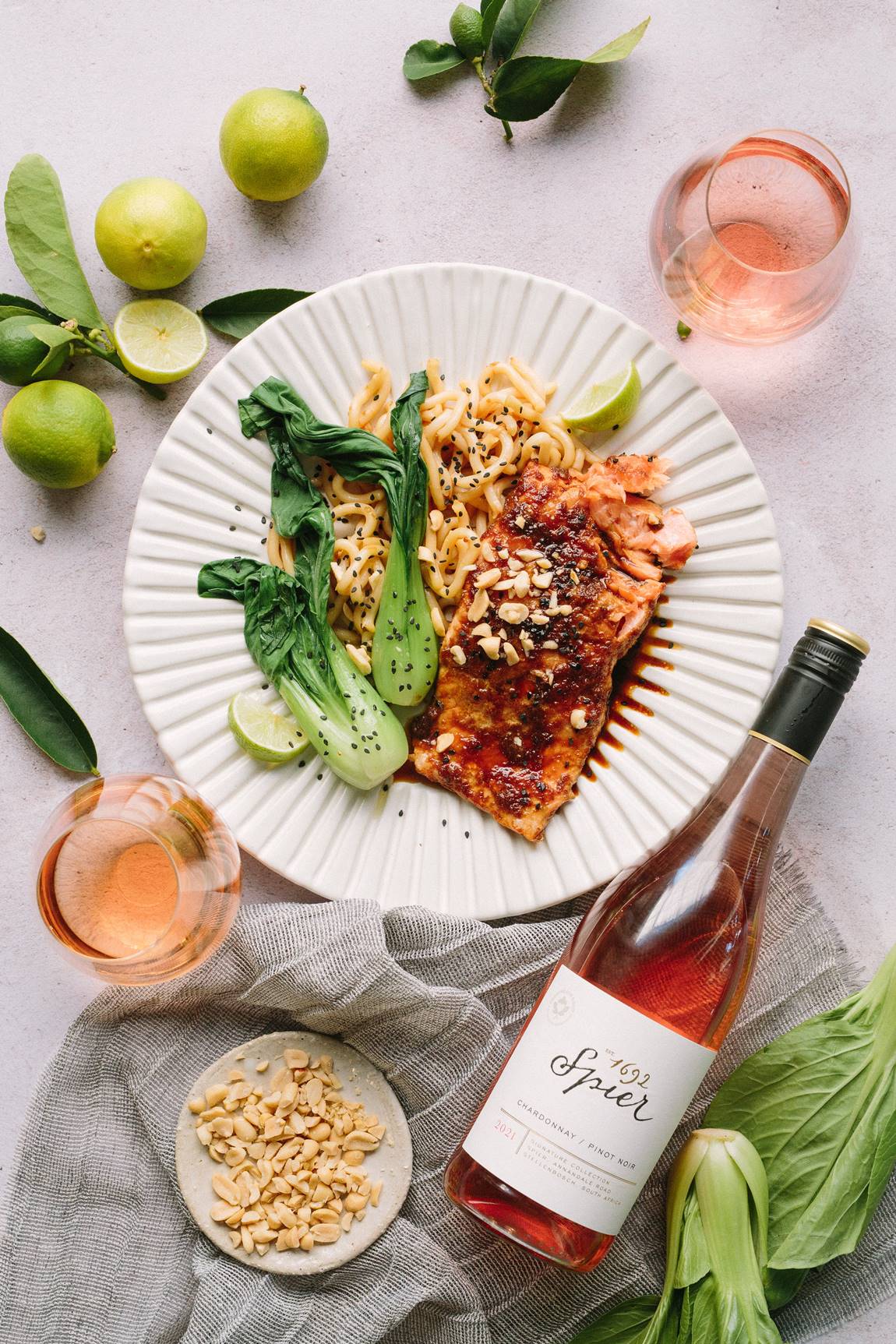 Signature Chardonnay/Pinot Noir with honey, soy and ginger-glazed salmon with pak choy and peanuts