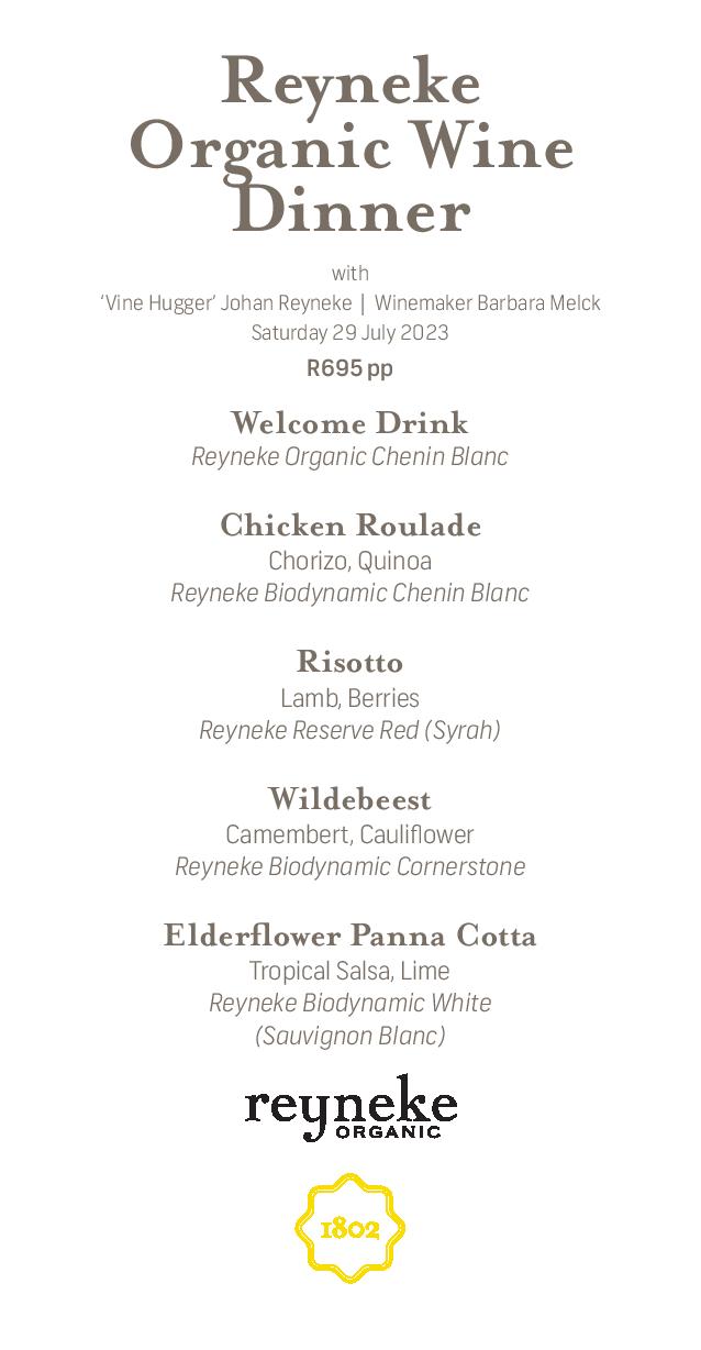 Prepare to tantalize your taste buds as the menu unveils a symphony of flavors expertly crafted to complement the exceptional Reyneke Organic Wines. The culinary journey begins with a delightful chicken roulade, followed by a tantalizing risotto with lamb and berries. The main course showcases the rich flavors of Wildebeest, expertly prepared to perfection. Finally, indulge in the sweet sensation of an Elderflower Panna Cotta, the perfect finale to this gastronomic experience.