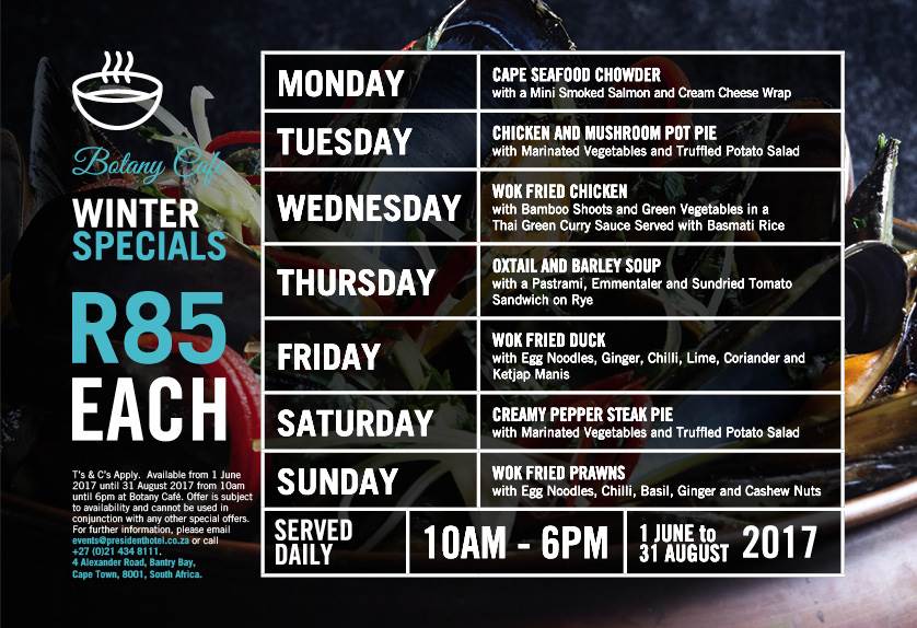 Make the most of winter and indulge in your favourite dishes for only R85. These can be complimented with a glass or two from the brand new wine list! The President Hotel has partnered with 14 different wine farms to provide guests with the best wine selections in the country.