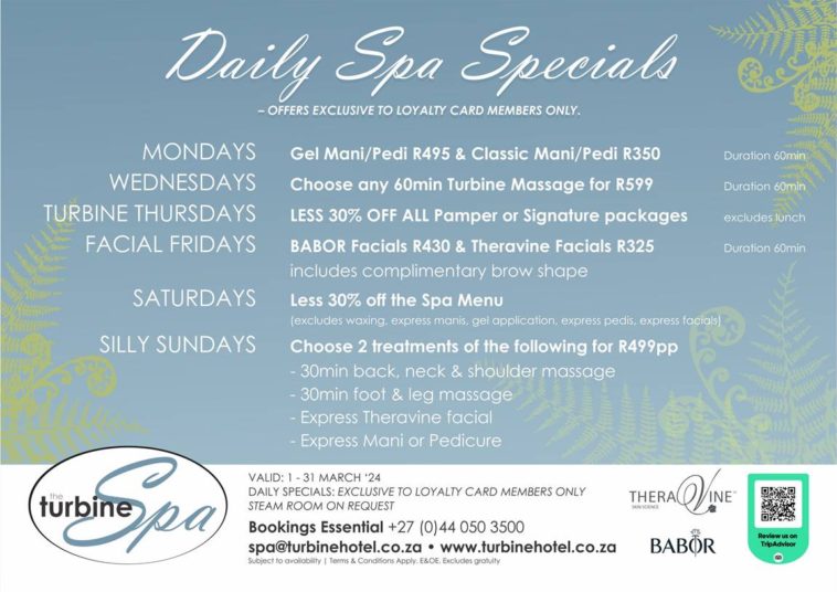 Enjoy a day of luxurious pampering with The Turbine Hotel’s with these Daily Spa Specials.