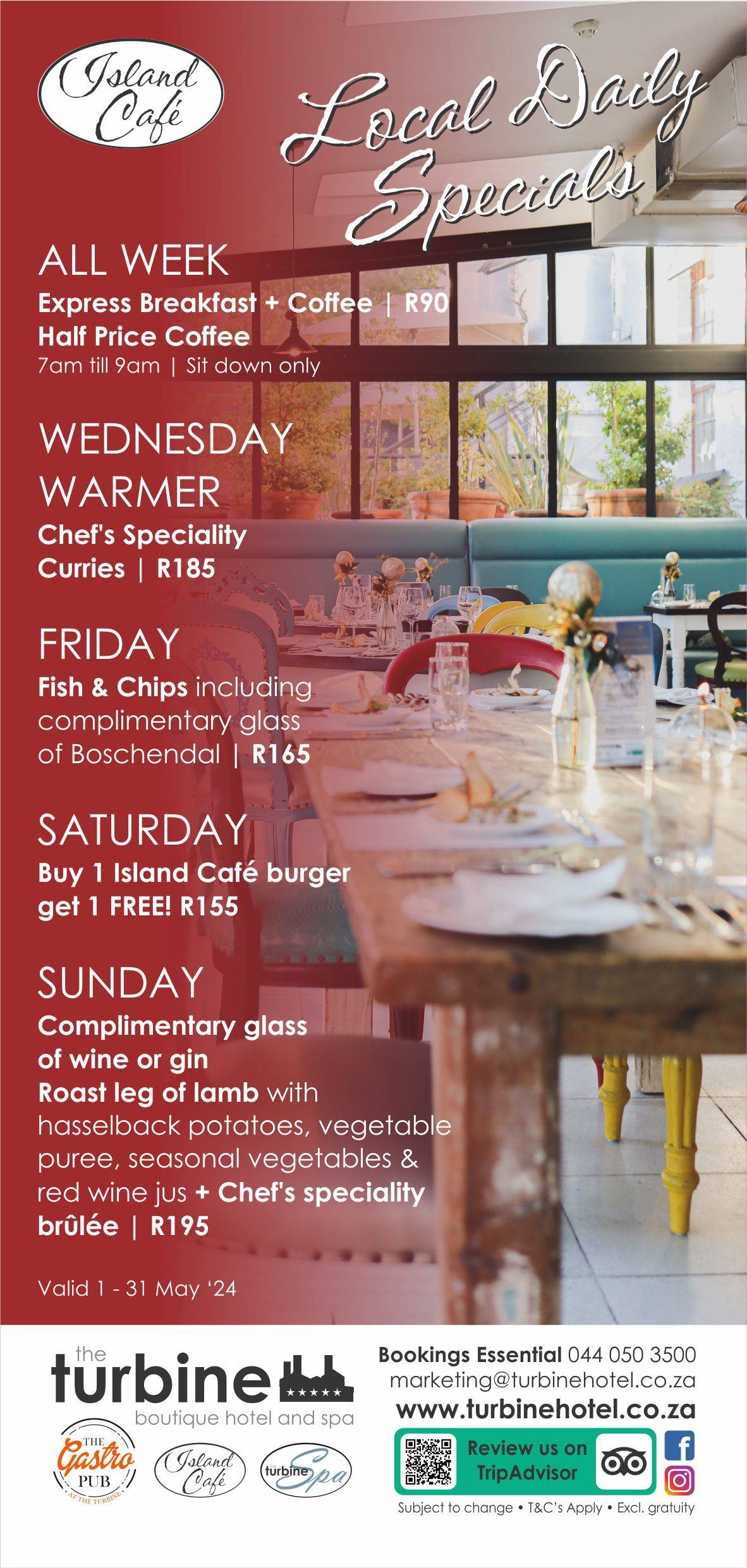 Island Café at The Turbine Boutique Hotel and Spa in Knysna is inviting locals and visitors to enjoy daily specials this May.