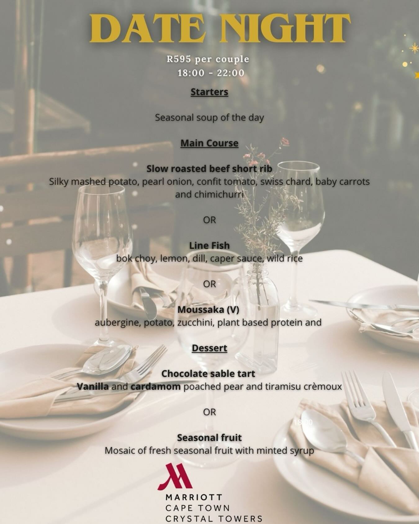 The Cape Town Marriott Hotel Crystal Towers is setting the mood until the end of November with an irresistible Date Night special at Pyrgos Restaurant.