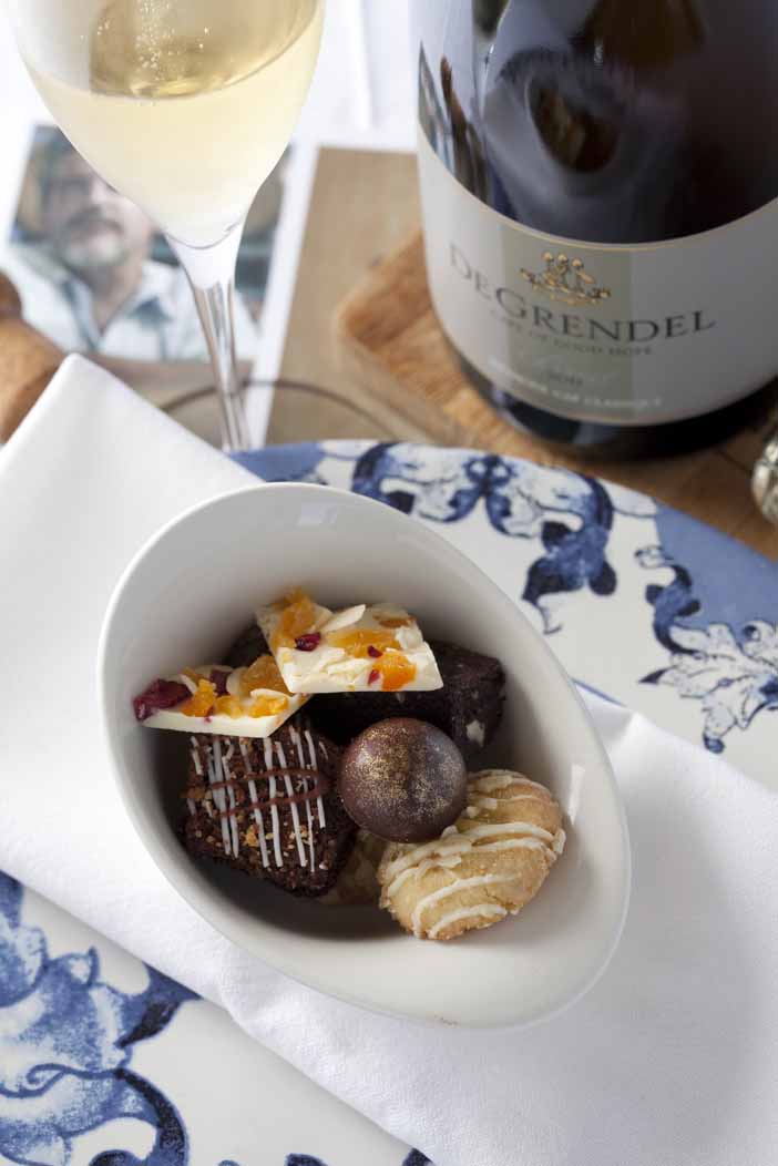 The elegant, airy dining spaces blend the present with touches of De Grendel’s past. The warmth of wood, old family photographs and other symbols of the Graaff family history combines with contemporary elements. A unique design feature is the glass-walled kitchen with its wrap-around views. Diners can watch the kitchen brigade at work, when not drinking in the vistas of vineyards, the working farm and Table Mountain.