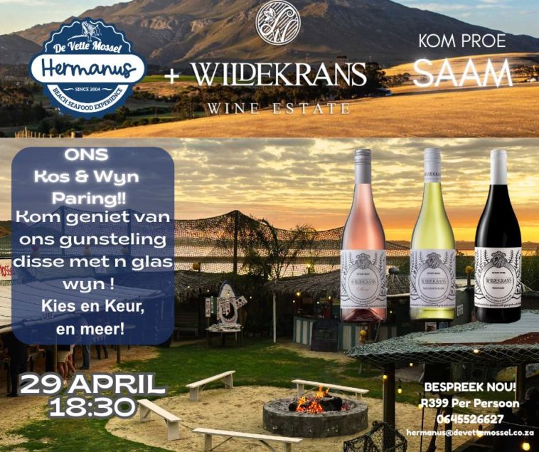 On Wednesday, 29 April at 18:30, the restaurant teams up with Wildekrans Wine Estate for a relaxed food and wine pairing evening by the coast.