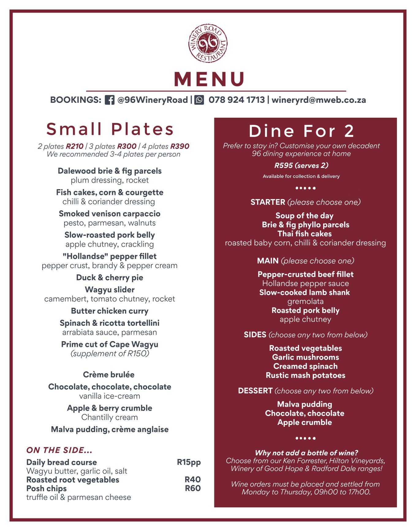 Try 96 Winery Road’s new menu – they’re open for sit-down!