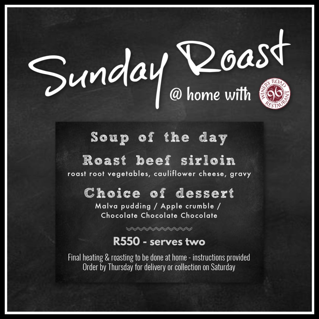 Enjoy a 3 course menu of soup, sirloin, cauliflower with cheese, plus gravy and a choice of dessert: either malva, apple crumble or something chocolatey. The menu serves 2 and is R550 per couple. Final roasting and heating to be done at home – instructions will be provided. Order by Thursday for delivery/collection on Saturday .