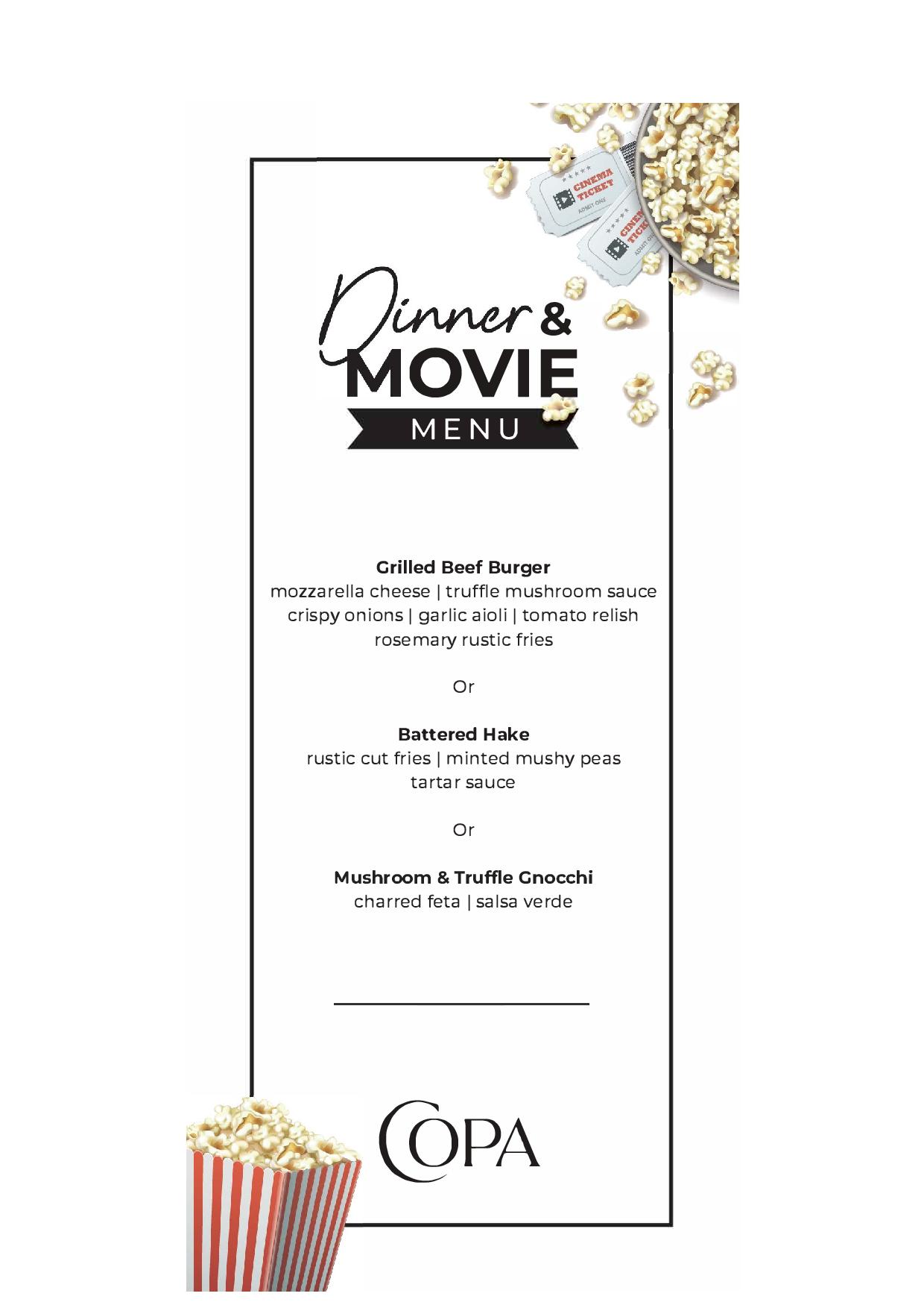 Join them for dinner at COPA Restaurant, popcorn, complimentary parking and a movie ​for only R265 per person.