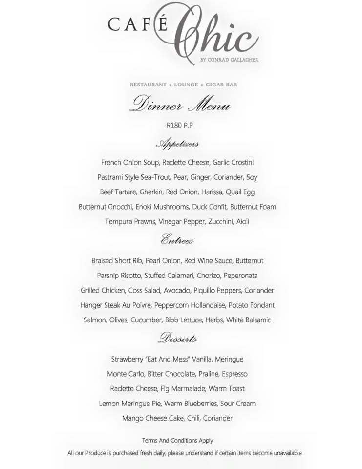 Executive Chef, Conrad Gallagher, has recently introduced a new dinner menu where guests may choose from a 3 set menu which includes a full range of appetizers, entrees and desserts. The dinner set menu is available for R180 per person. We have added the menu and a few images for your below.