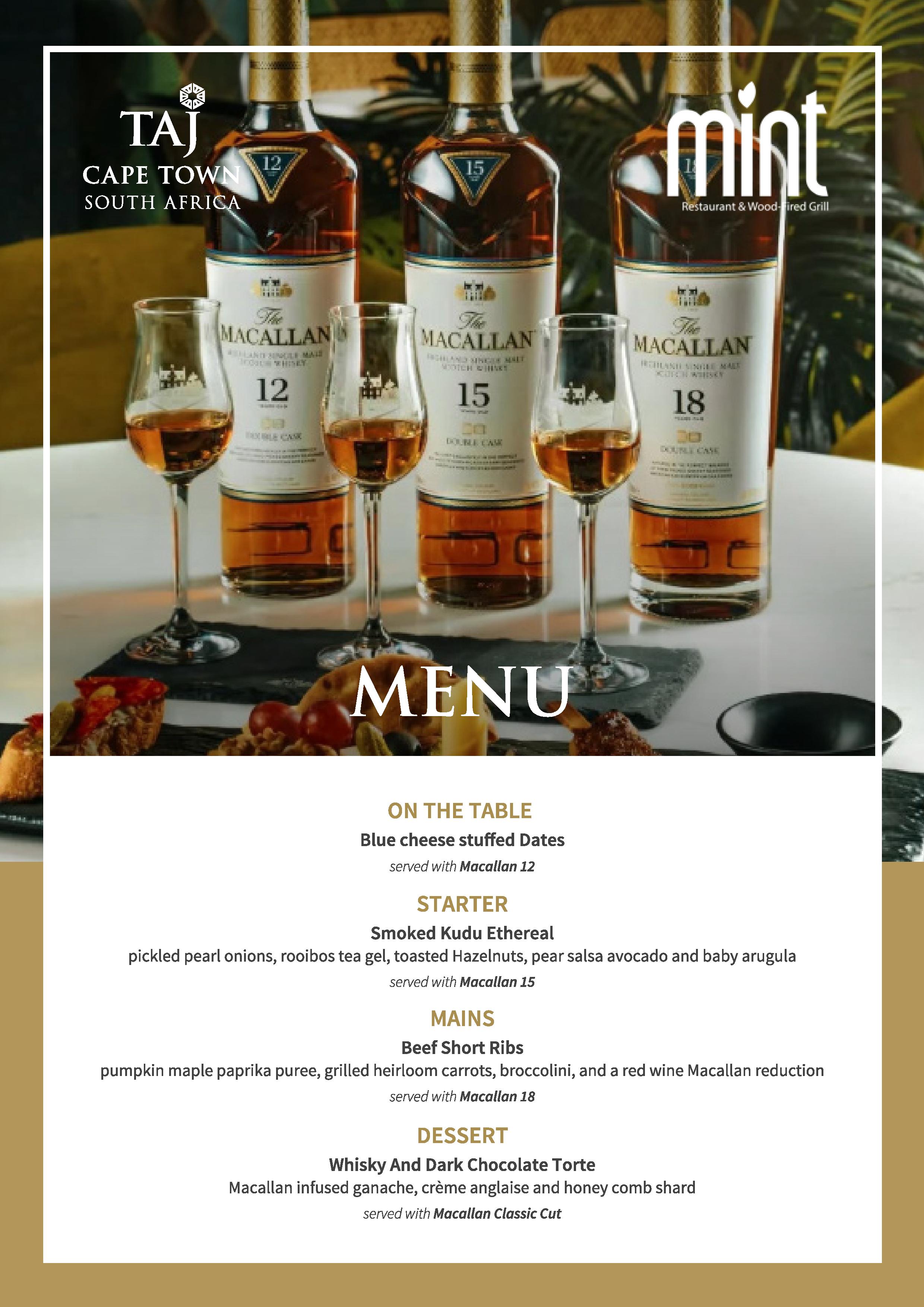 In a distinguished partnership with The Macallan — the globally celebrated icon of single malt Scotch whisky — The Mint Restaurant & Wood-Fired Grill at Taj Cape Town invites you to an exclusive four-course whisky pairing dinner, designed to captivate the senses and honour the legacy of fine craftsmanship.