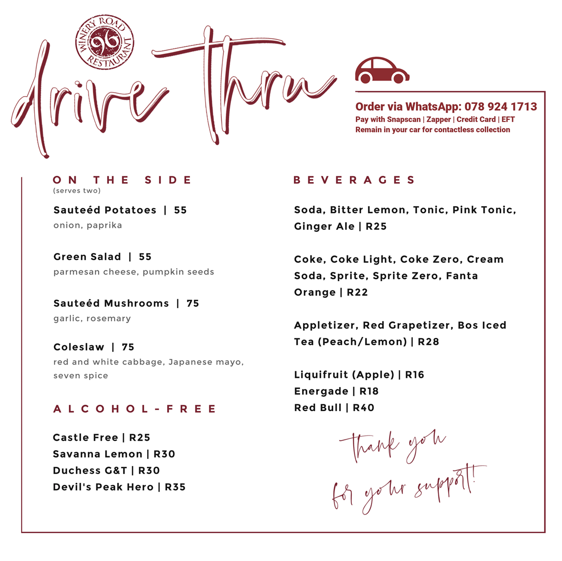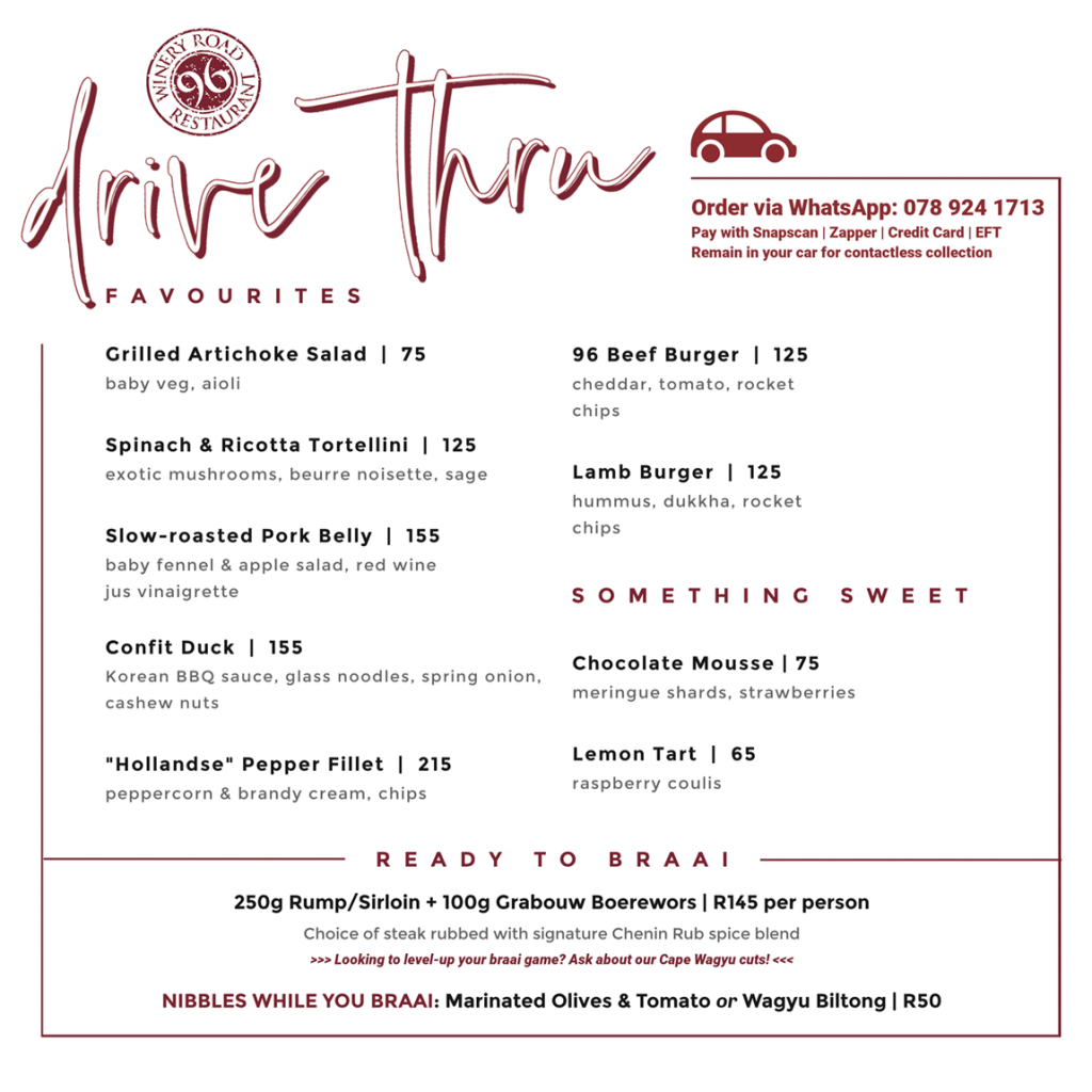 The restaurant is now offering a #DriveThru menu of ready-to-eat favourites (full size portions), as well as their famous beef paired with Grabouw boerewors – ready to pop onto your braai!