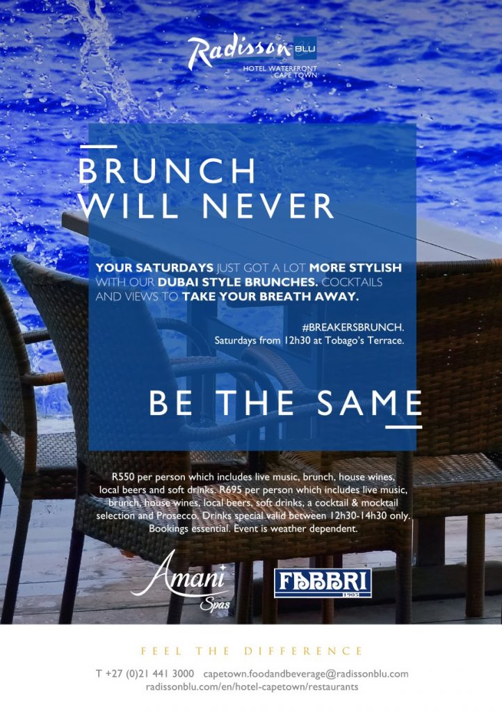 Brunch at Tobago’s Restaurant and Terrace at the Radisson Blu Hotel Waterfront begins at 12h00 and is R550 per person, including all brunch items, house wines, local beers, and soft drinks or R695 per person for food and house wines, local beers, soft drinks, a selection of cocktail, mocktails and Prosecco.
