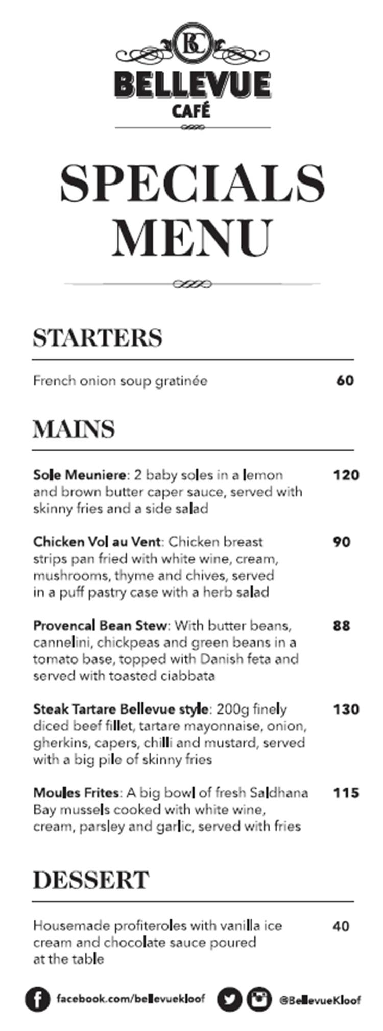 During the month of March, Bellevue Cafe is offering a fantastic menu at great value. A variety of starters, mains and desserts are available. My absolute favourite has to be the steak tartar and at R130 it’s an absolute steal.The baby soles in a lemon and brown butter caper sauces also sound incredible. Whatever you choose, it’s bound to be very delicious!