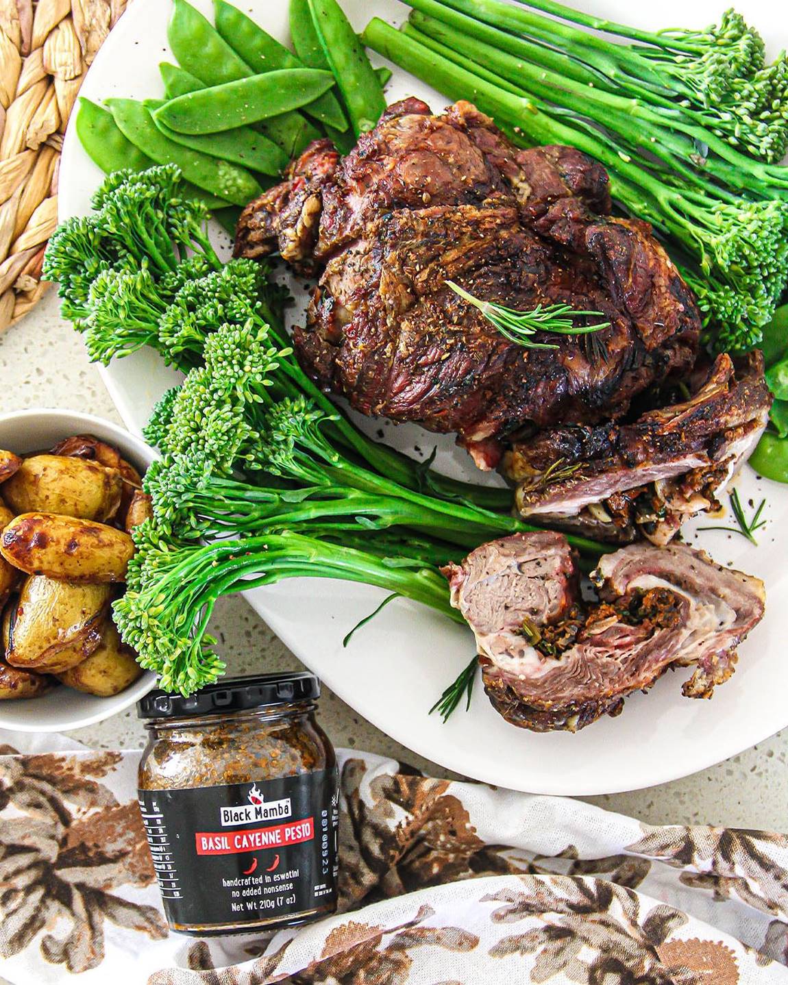 This delicious Basil Cayenne Stuffed Lamb by GlamFoodie is the ultimate addition to any eat-until-you-get-sleepy family shindig. Featuring lashings of Black Mamba Basil Cayenne Pesto, it’s ready to take centre-stage and share the limelight with all those classic trimmings like roast potatoes and gravy.