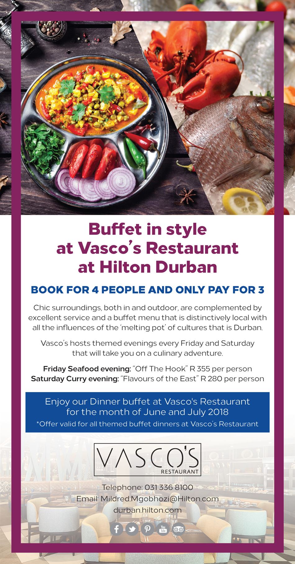 On Fridays, you can join the popular seafood evenings “Off the Hook” for only R355 per person at Vasco’s Restaurant. On Saturdays, you can enjoy the best curry with a flavours of the East edition of the popular buffet offering. This only costs R280 per person.