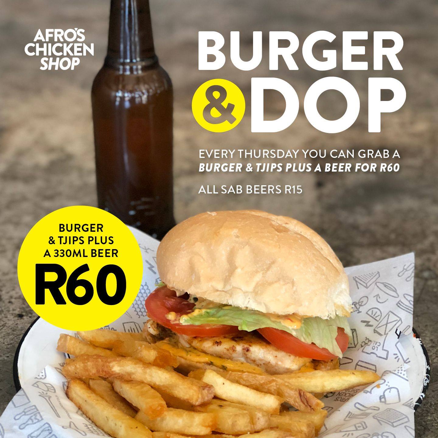 Pull in to Afro’s at the Bluff, Glenwood or Umhlanga for this Burger & Dop special!