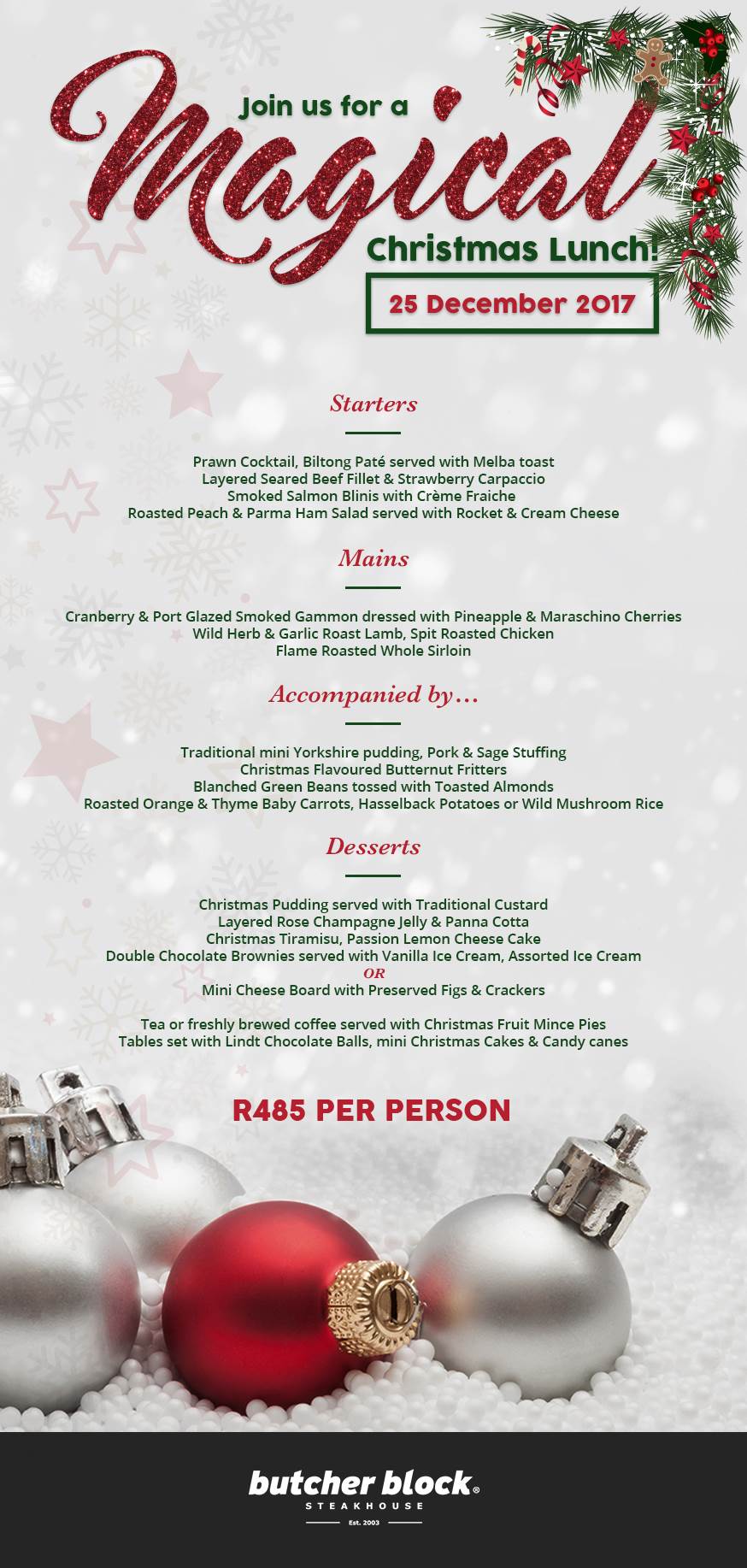 If you don’t want to spend Christmas Day labouring in the kitchen, why not head over to Butcher Block on the Monday. A delicious three course lunch will be presented for only 485 per person. As seats are limited, please remember to call them as soon as possible.